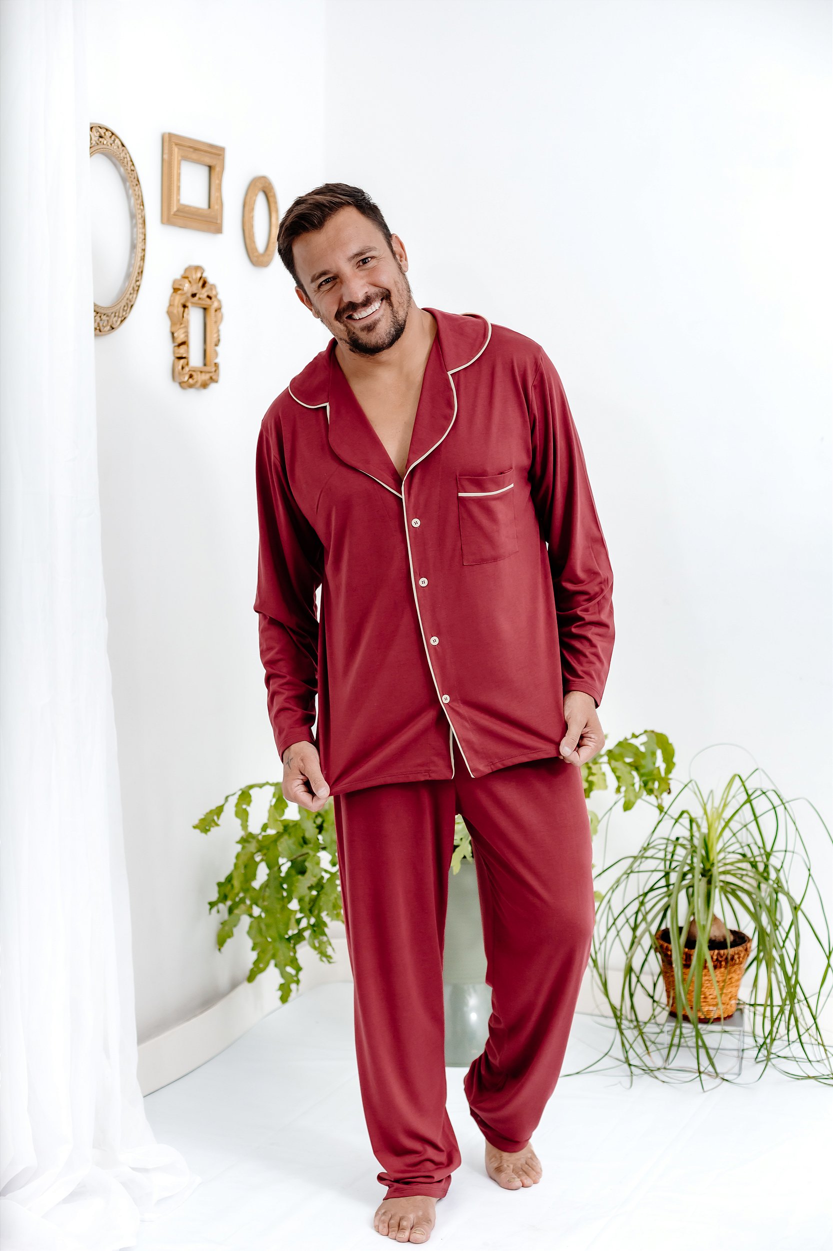 Pijama masculino longo estilo americano, com aplicação de "vivo" na abertura dos botões e bolso.