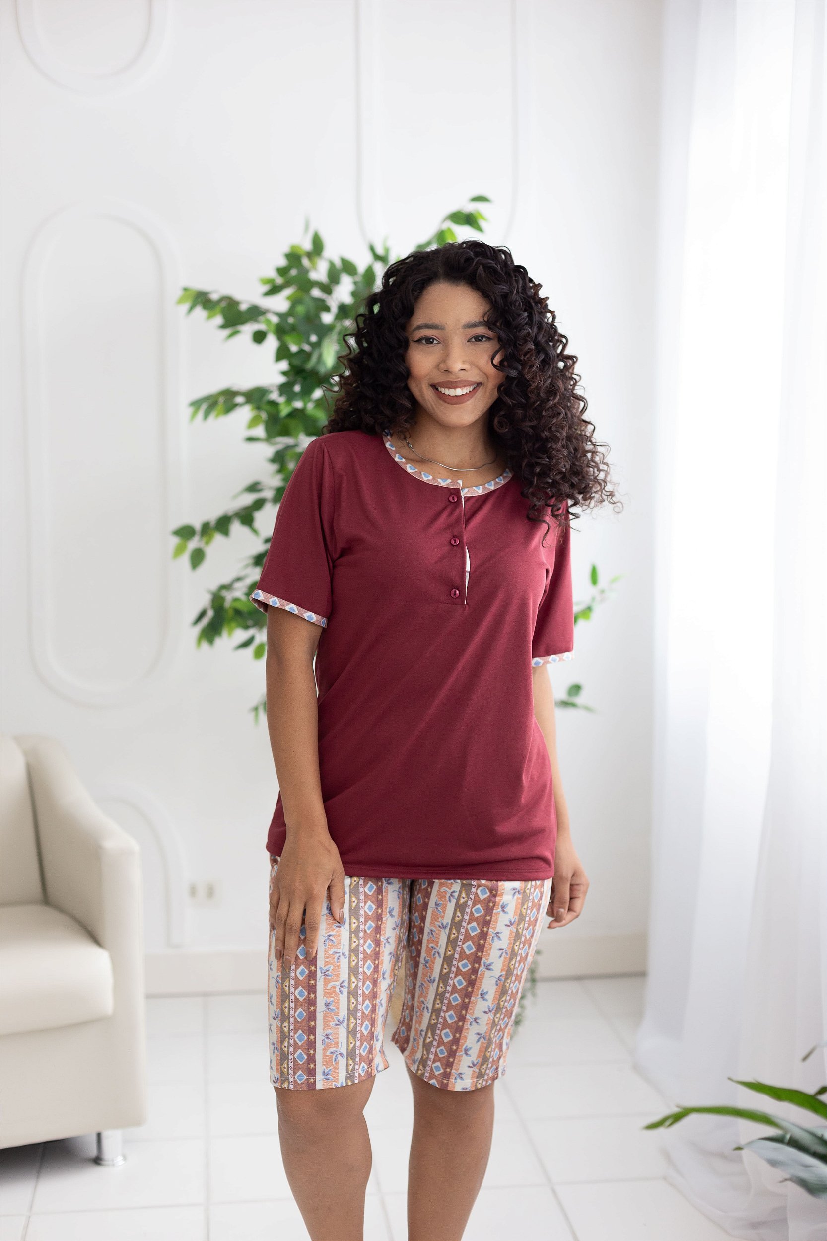 Pijama com bermuda ciclista em meia malha. Blusa com patê e botões em malha lisa com viés listrado no decote e barra das mangas; na mesma cor da bermuda. Bermuda em malha listrada.