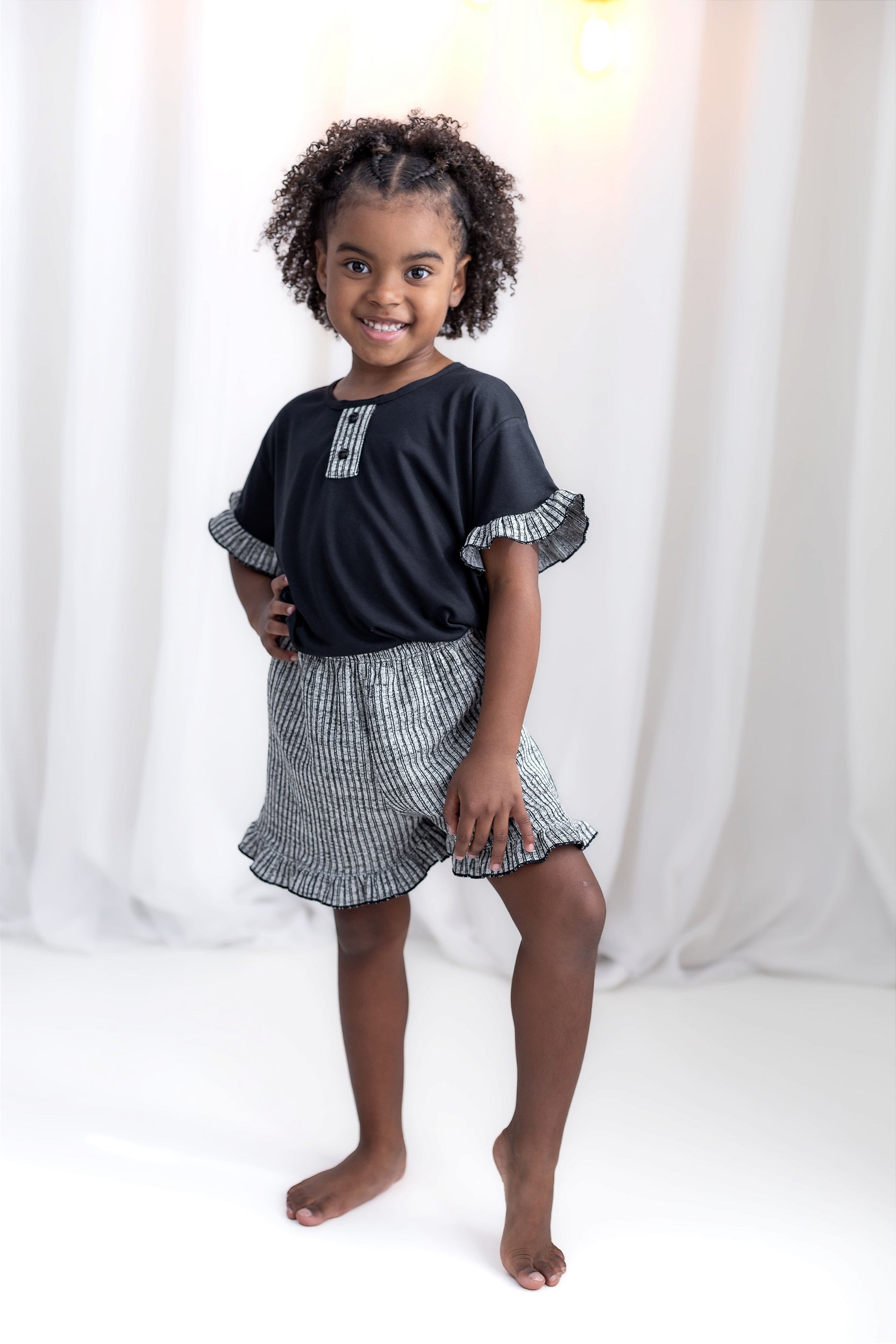 Short doll curto, blusa em meia malha com detalhes em babadinhos, short em tecido canelado belga.