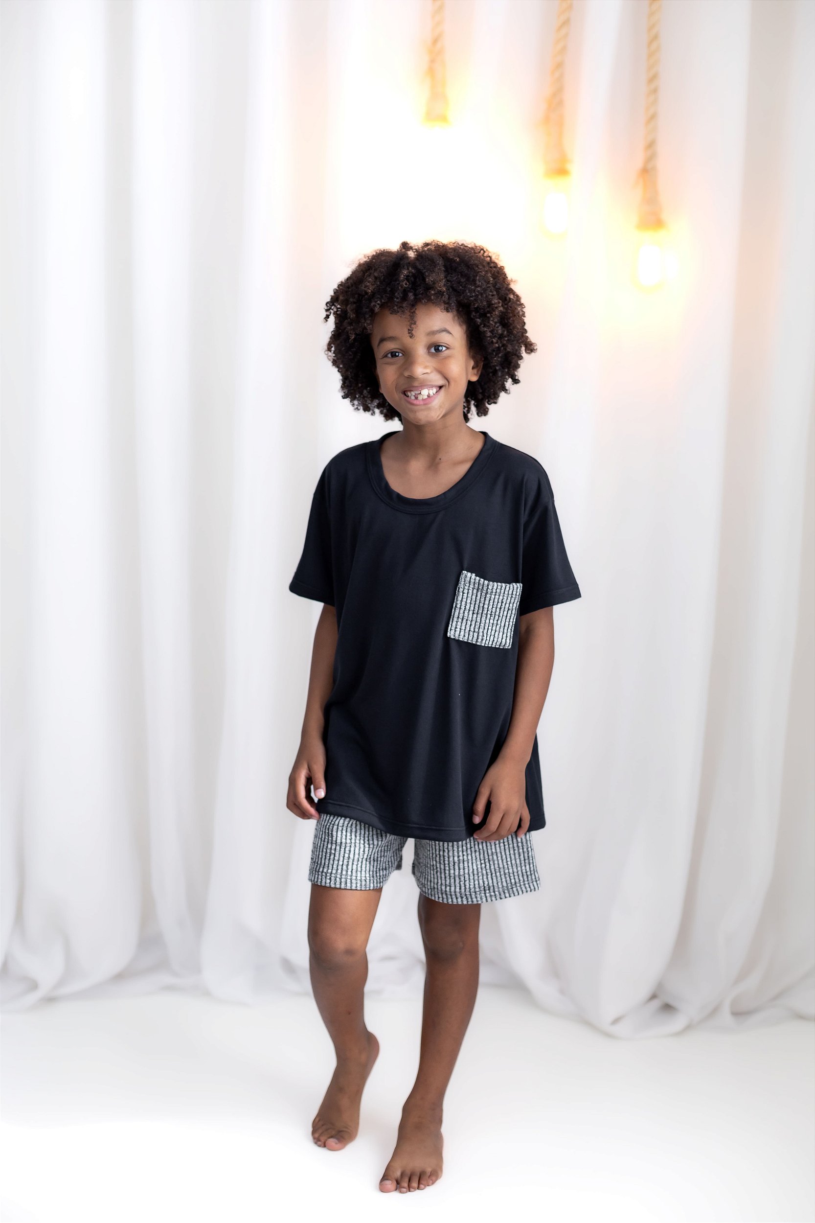 Short doll curto masculino, blusa em meia malha com detalhes de bolso, short em tecido canelado belga.