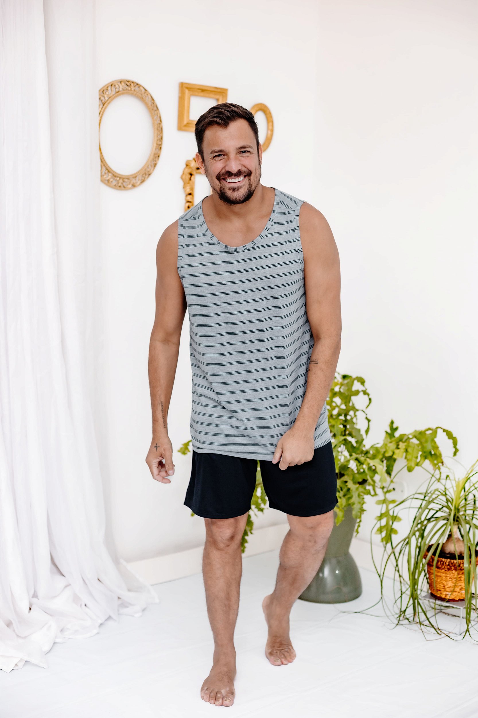 Pijama curto masculino, Blusa em malha listrada e short em malha lisa, cor é definida pelo short.
