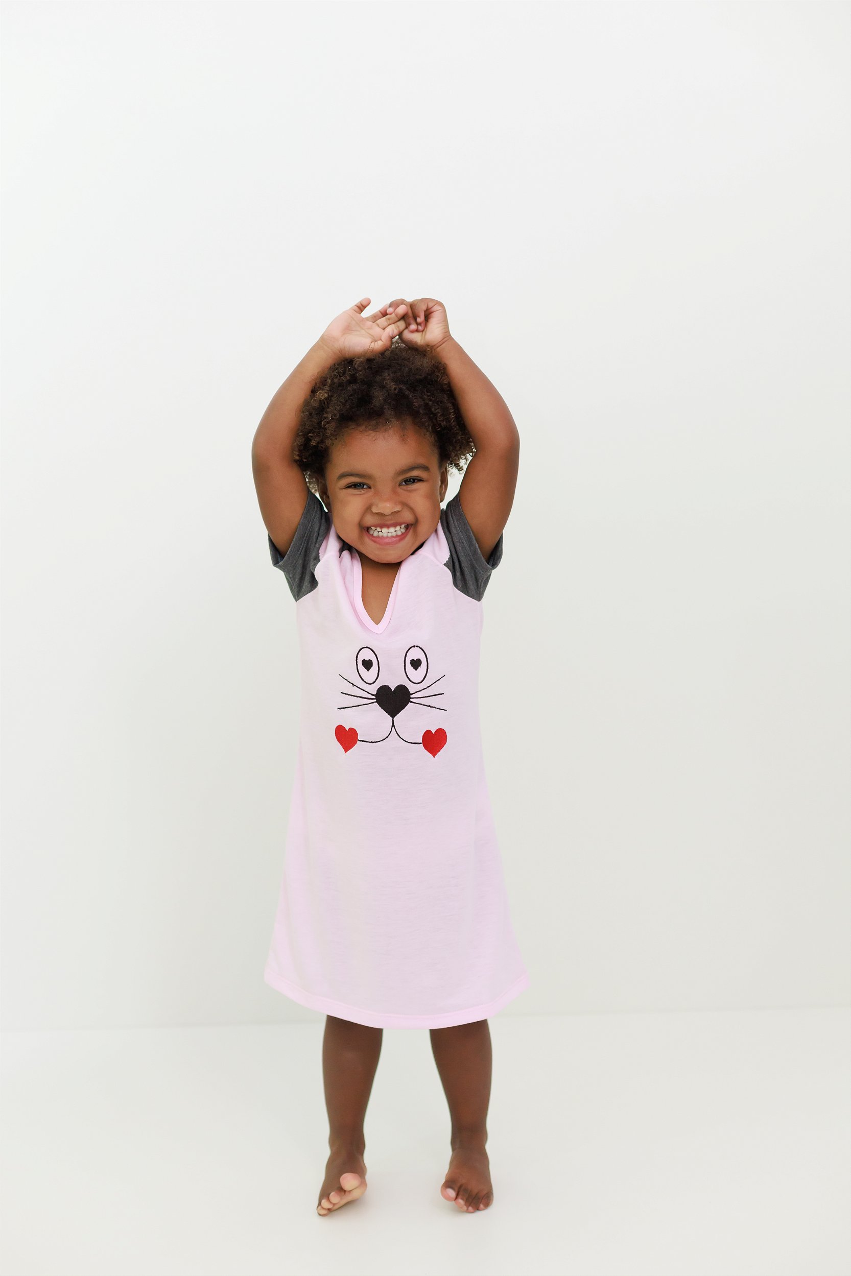 Camisola infantil 02-08 feminino confeccionado em tecido meia malha lisa com aplicação de bordado de gatinho.