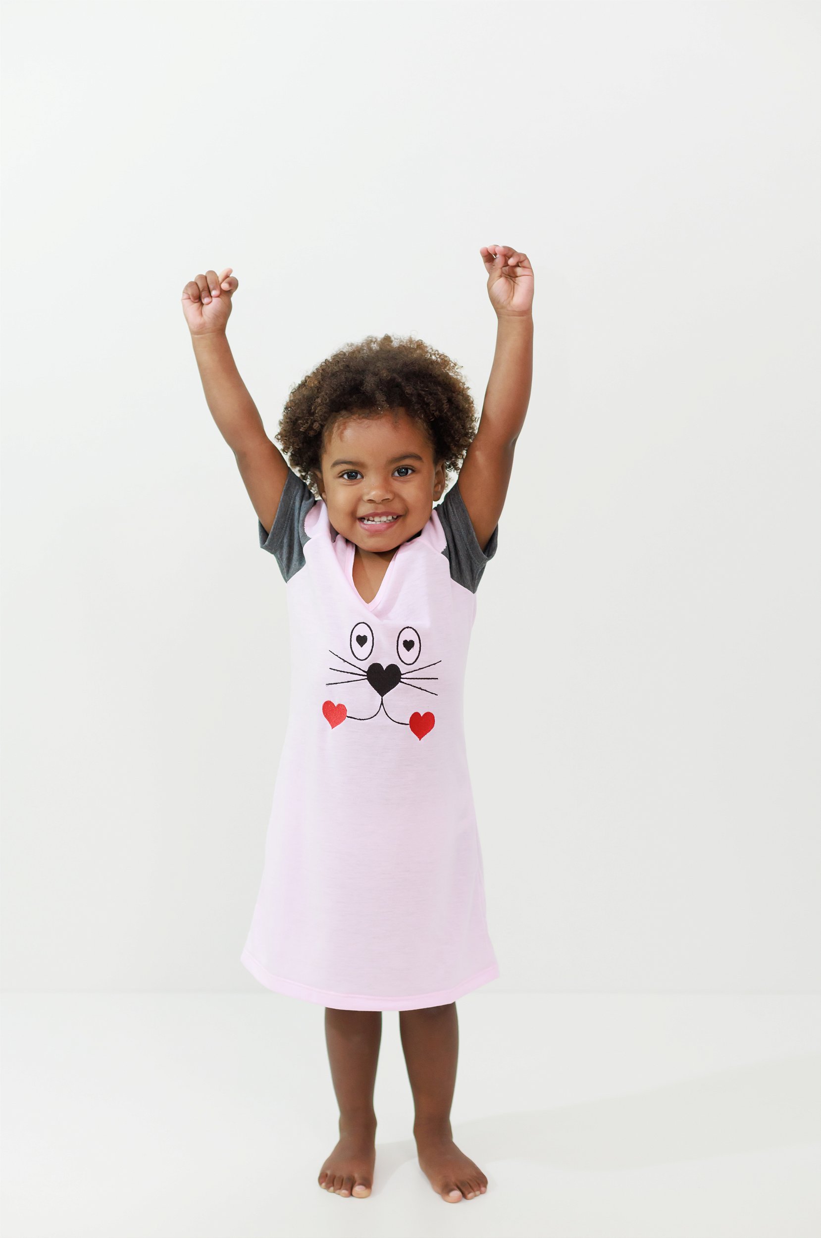 Camisola infantil feminino confeccionado em tecido meia malha lisa com aplicação de bordado de gatinho.