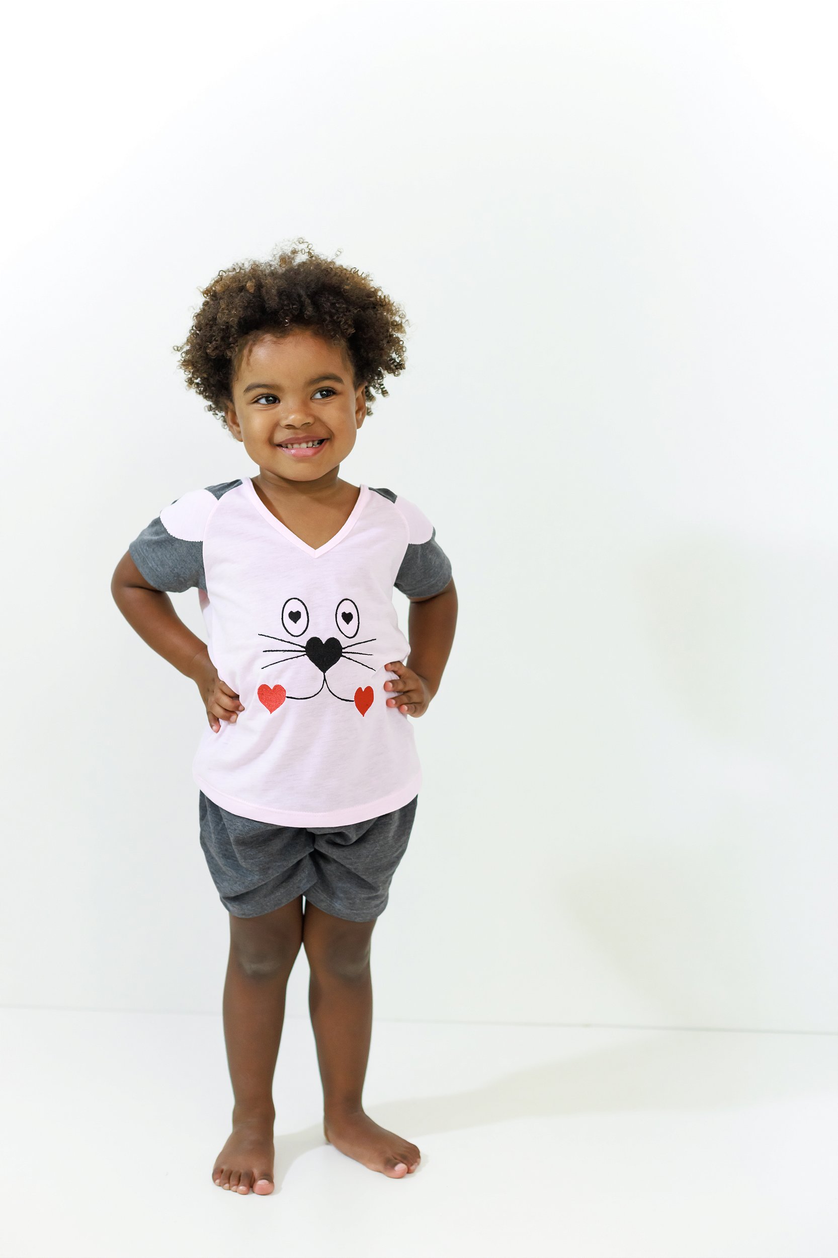 Short doll infantil feminino composto por blusa em meia malha lisa com bordado de gatinho e short em meia malha lisa.