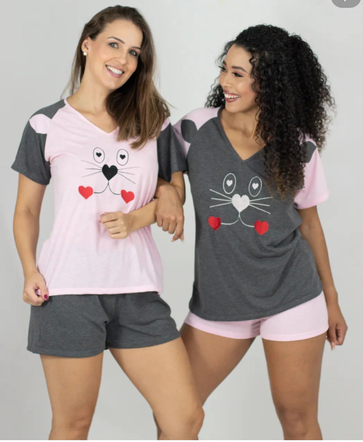 Short doll feminino composto por blusa em meia malha lisa com bordado de gatinho e short em meia malha lisa.