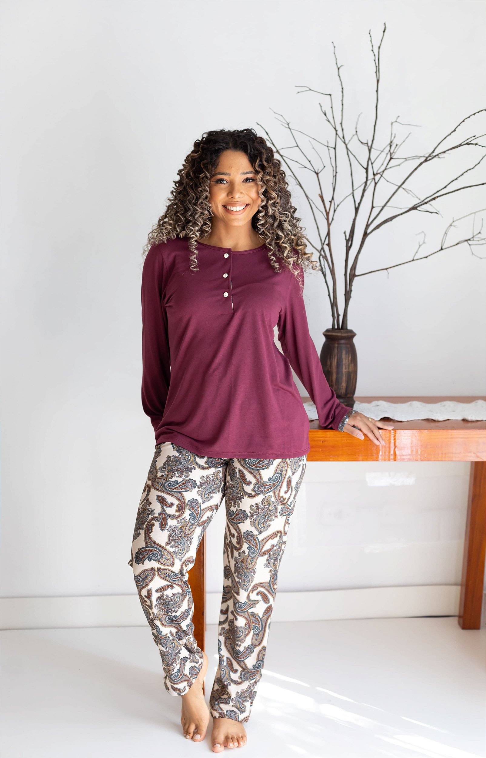 Pijama feminino composto por blusa lisa em manga longa com detalhe de patê e botões, calça estampada.