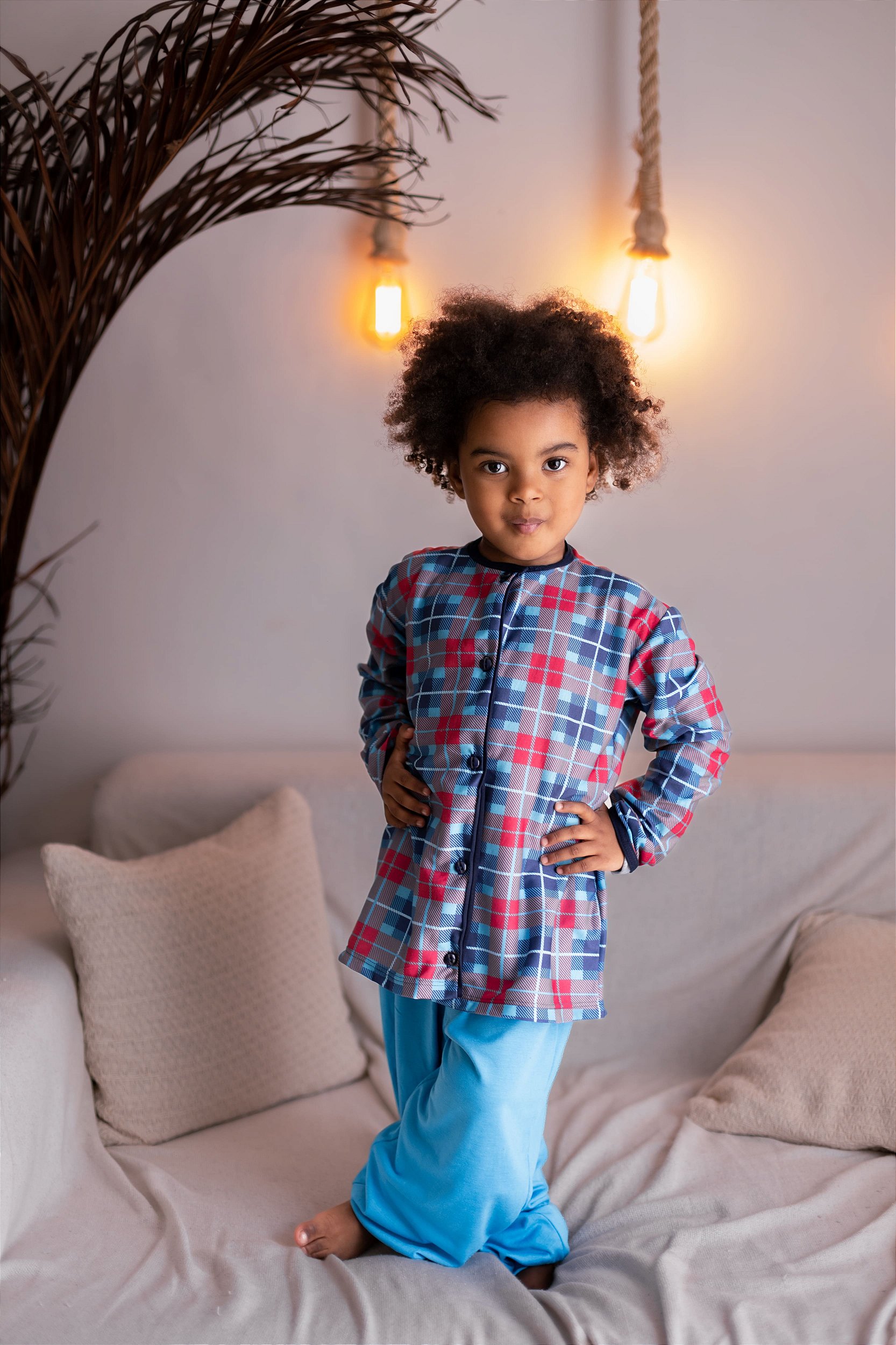 Pijama Juvenil 10-14 em meia malha. Blusa com botões na estampa xadrez para as duas cores de calça. Calça lisa Azul e Marinho.