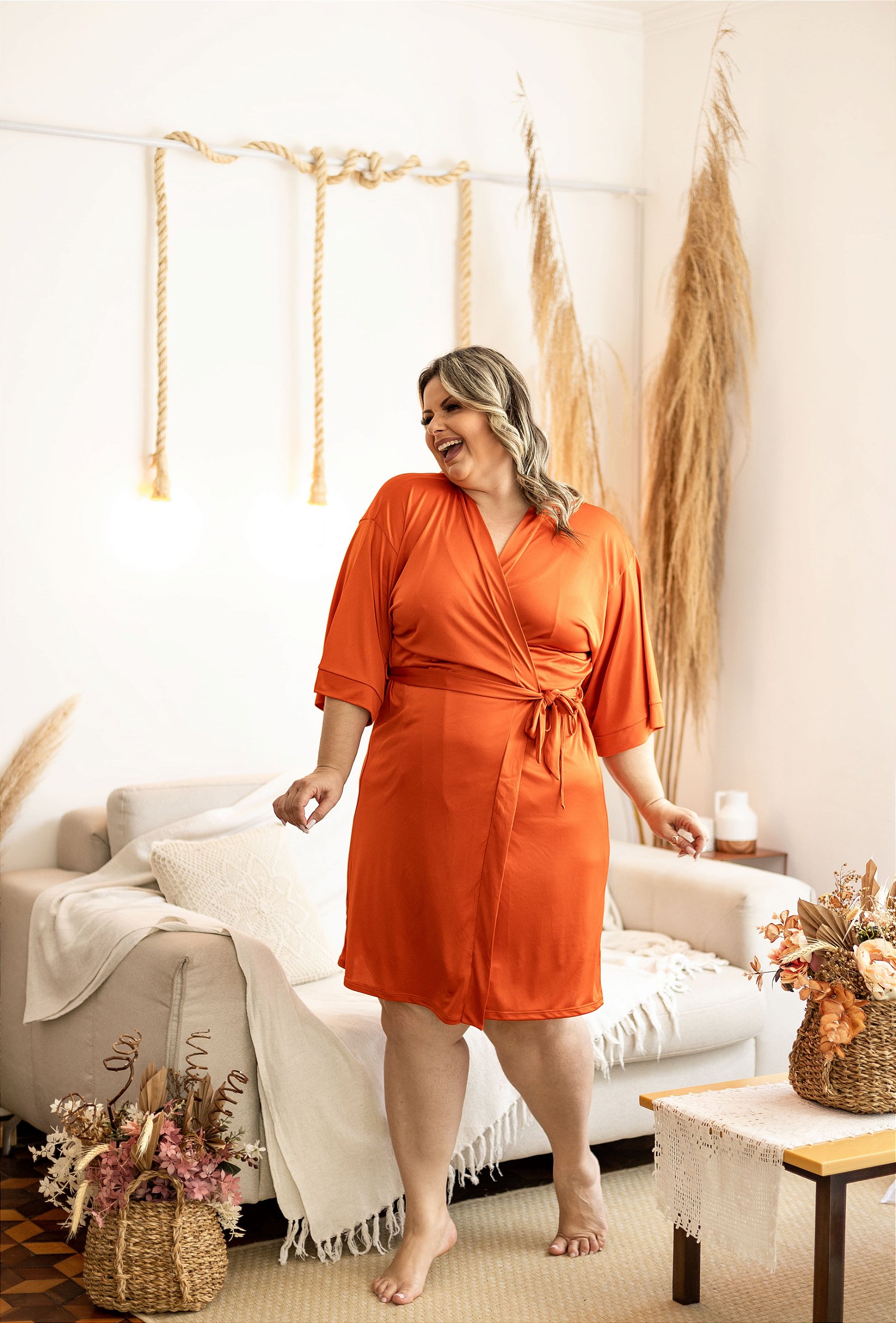 Robe Plus Size confeccionado em liganete liso com amarração frontal.