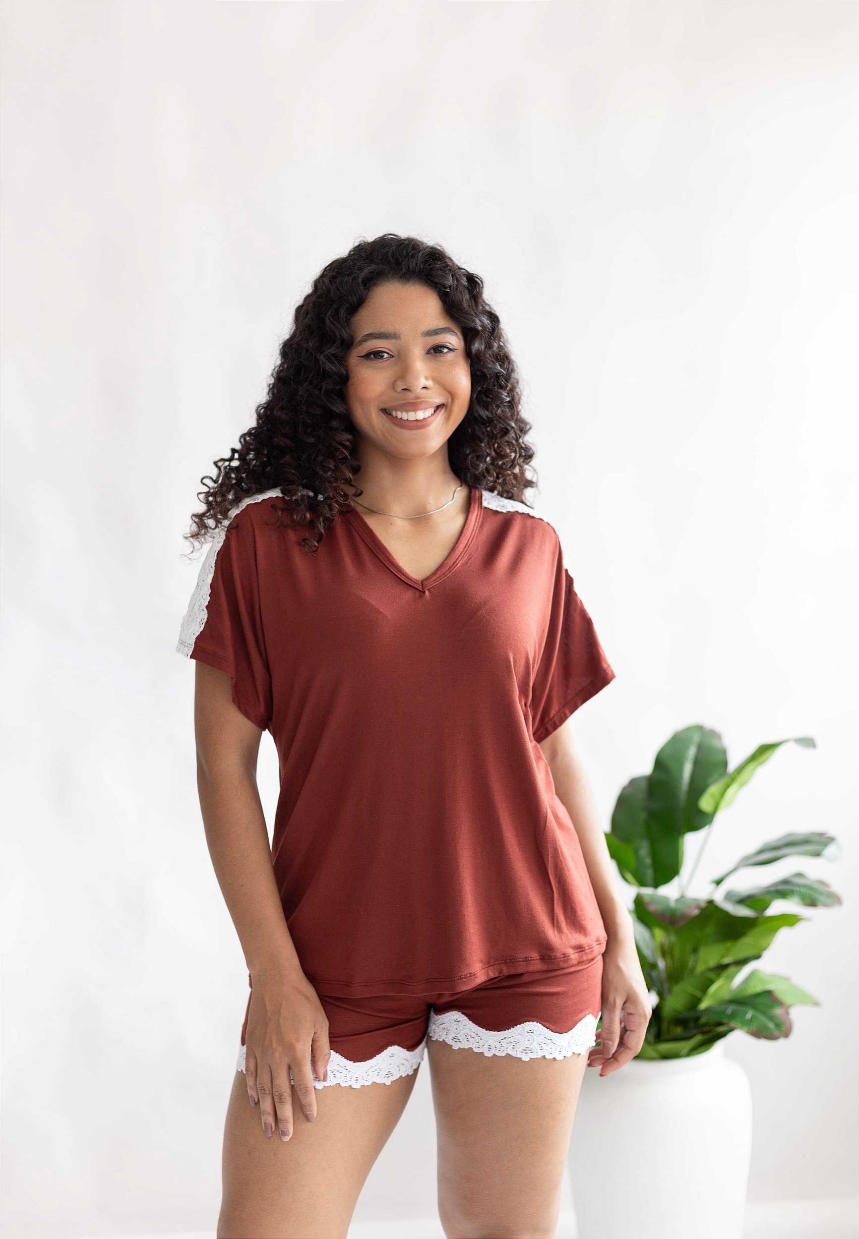 Short Doll em modal liso. Blusa Reglan com decote Vê. Aplicação de renda de poliamida com elastano nos ombos. Short com renda refilada na barra. Tecido: Modal liso e renda e renda depoliamida com elastano.