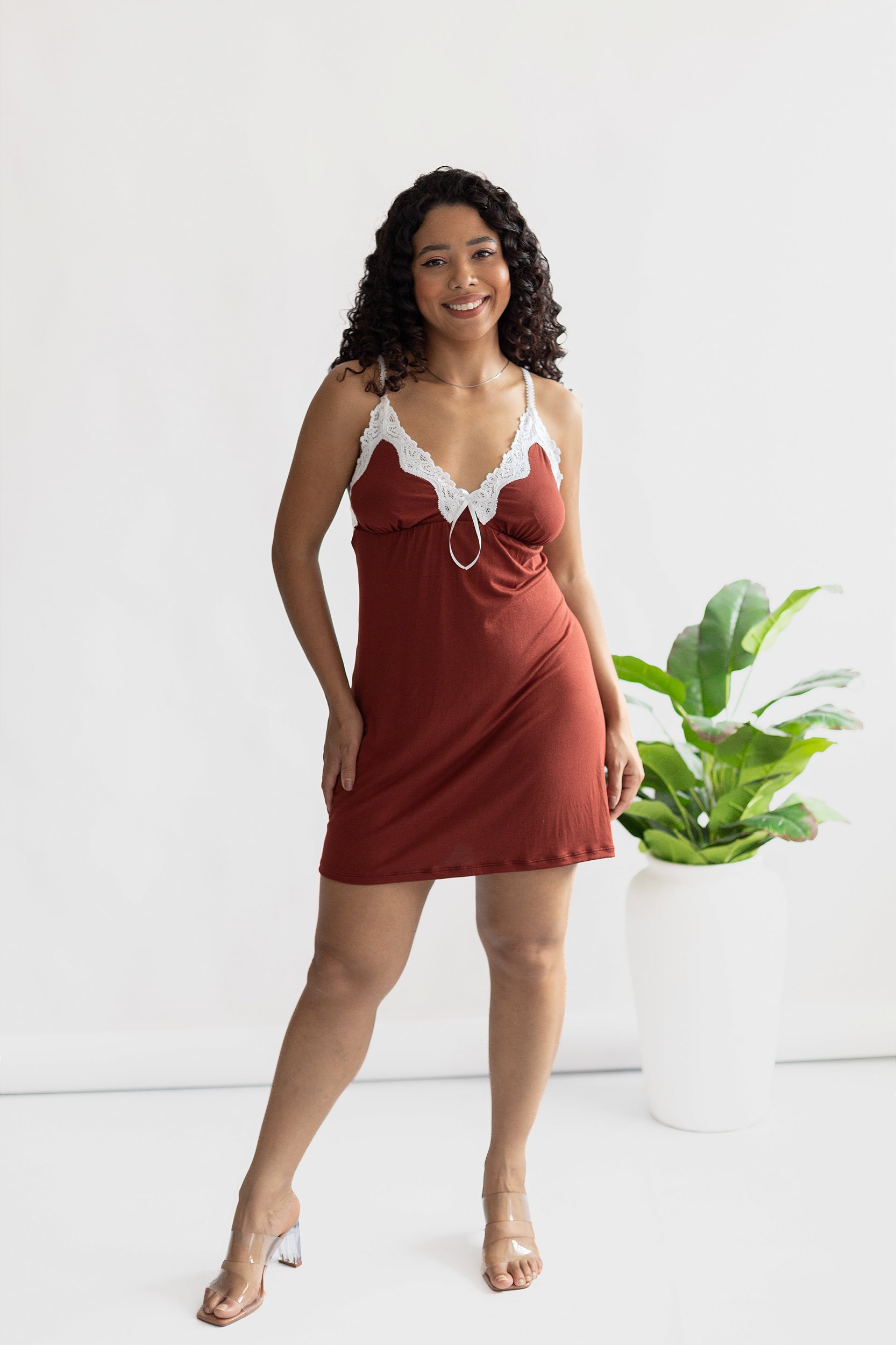 Camisola curta em tecido Modal com aplicação de renda no busto.