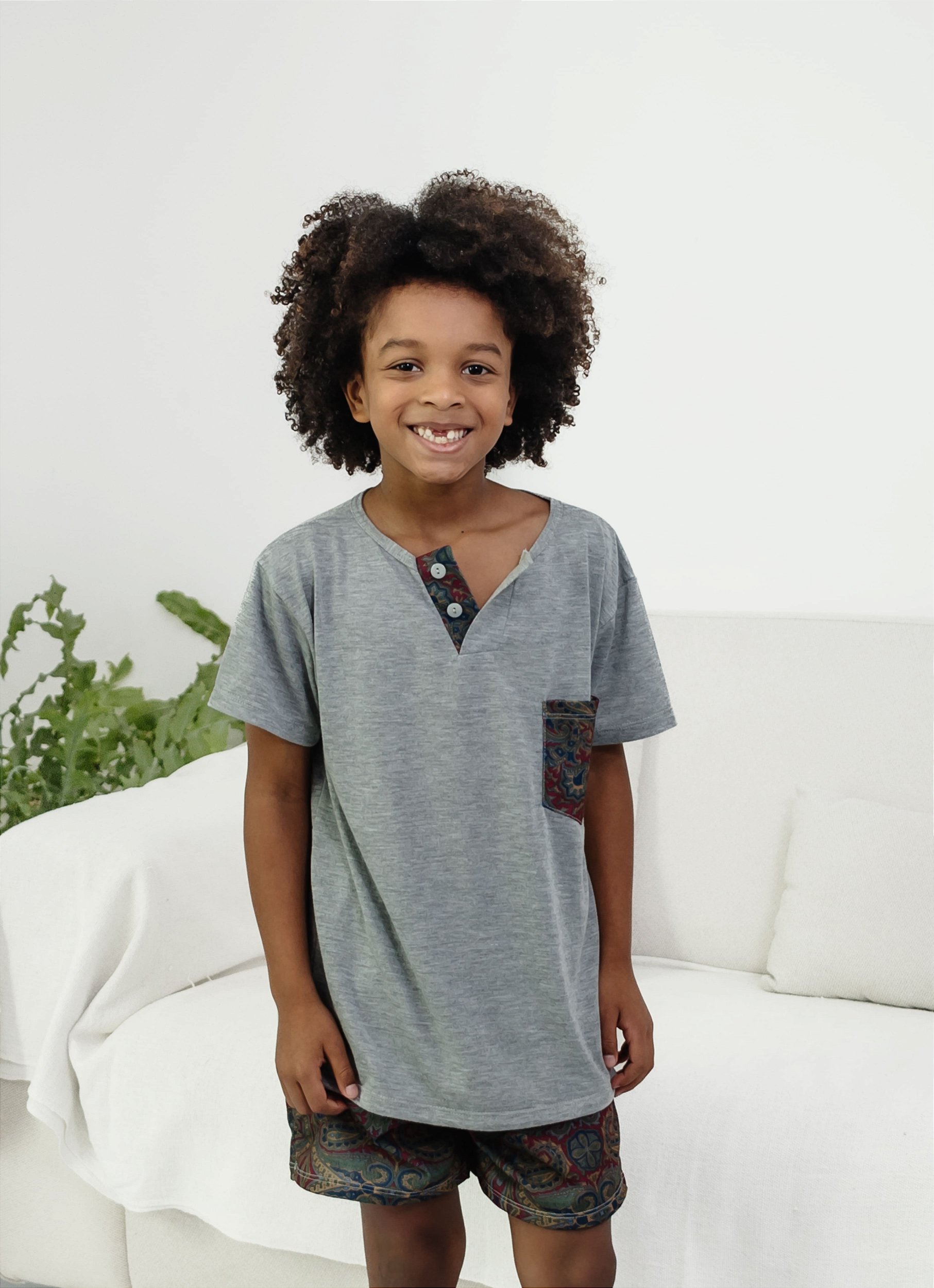 Pijama curto masculino, blusa em meia malha lisa com aplicação de bolsinho e patê, shorts em meia malha estampada.