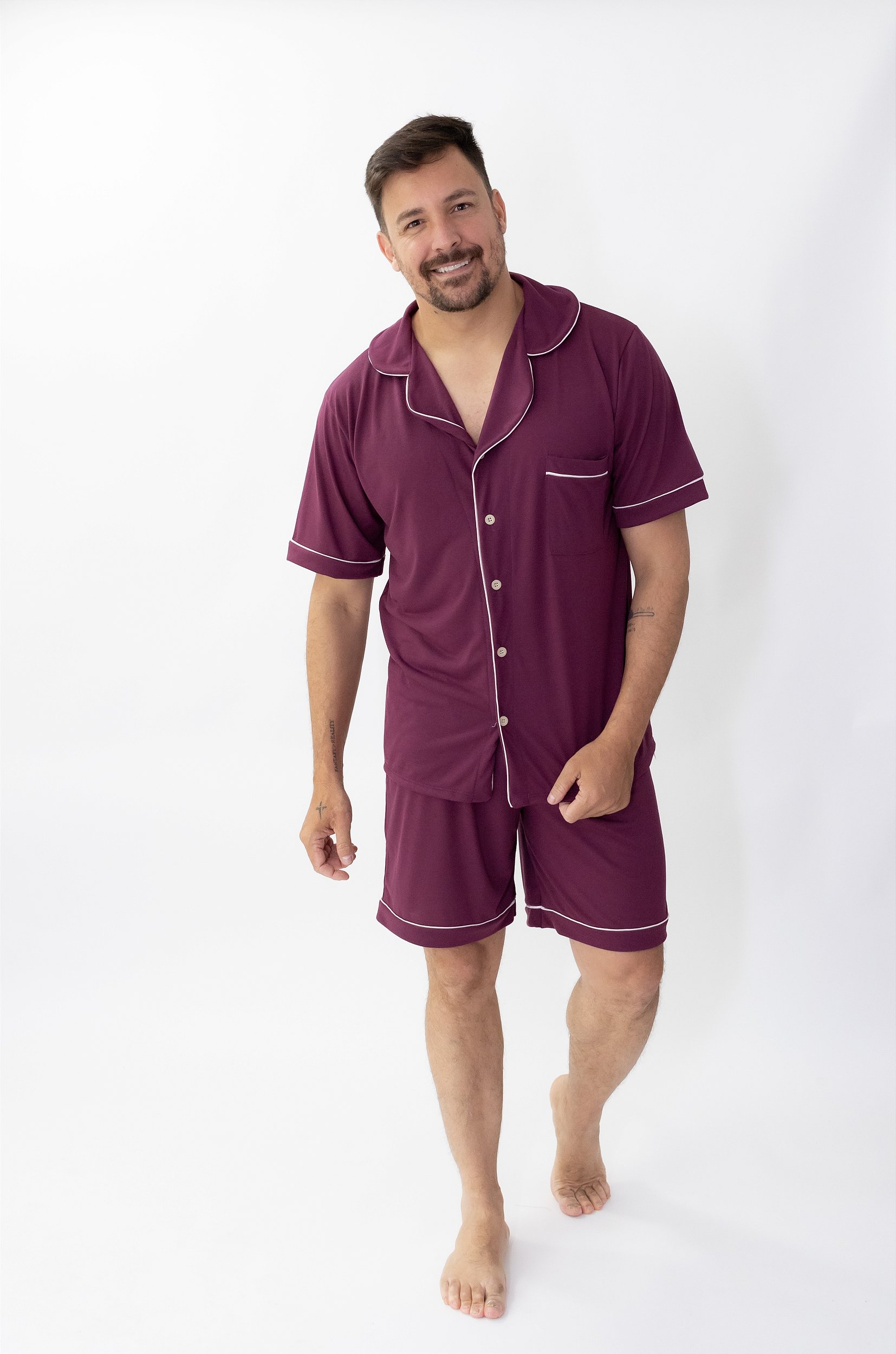 Pijama masulino em meia malha lisa. Pijama americano com vivo em cor contraste na gola, debrum, barra das mangas. Short com vivo na barra.