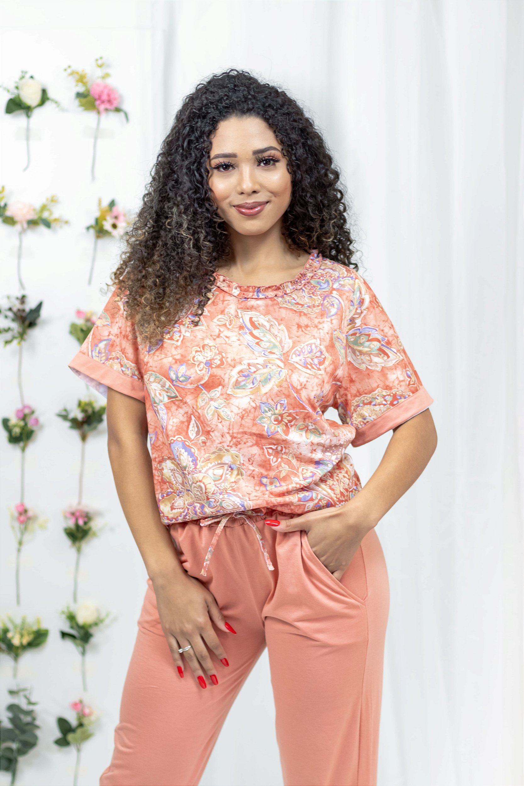 Pijama Pescador, Blusa em meia malha estampada com pequeno franzido na gola, e calça em meia malha lisa com detalhes em meia malha estampada.